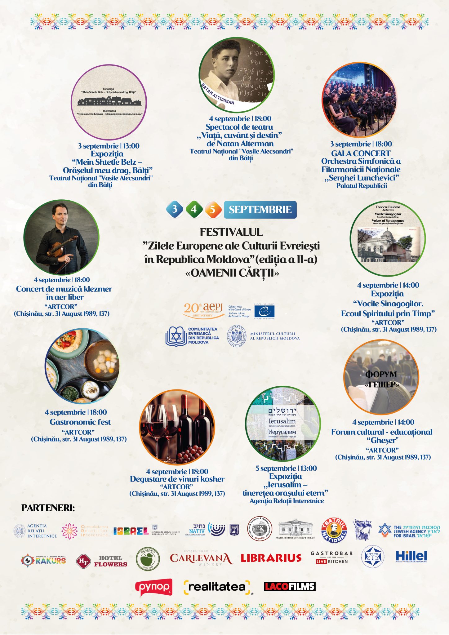 - 4 сентября, Кишинёв – Культурно-образовательный форум «Гешер» (14:00–18:30), ARTCOR, затем концерт клезмерской музыки под открытым небом и гастрономическое мероприятие (18:00–20:00).